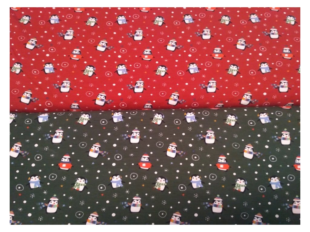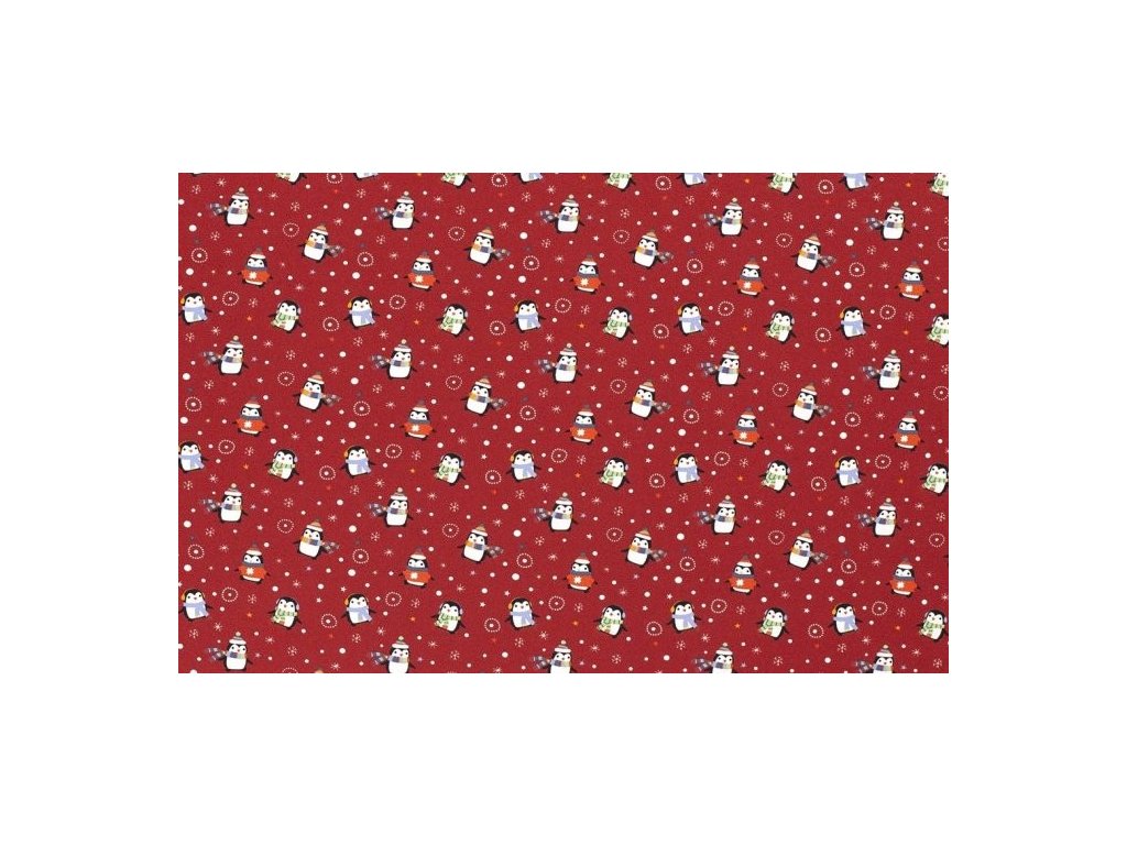 bavlněný úplet Vánoční tučňáci na červené